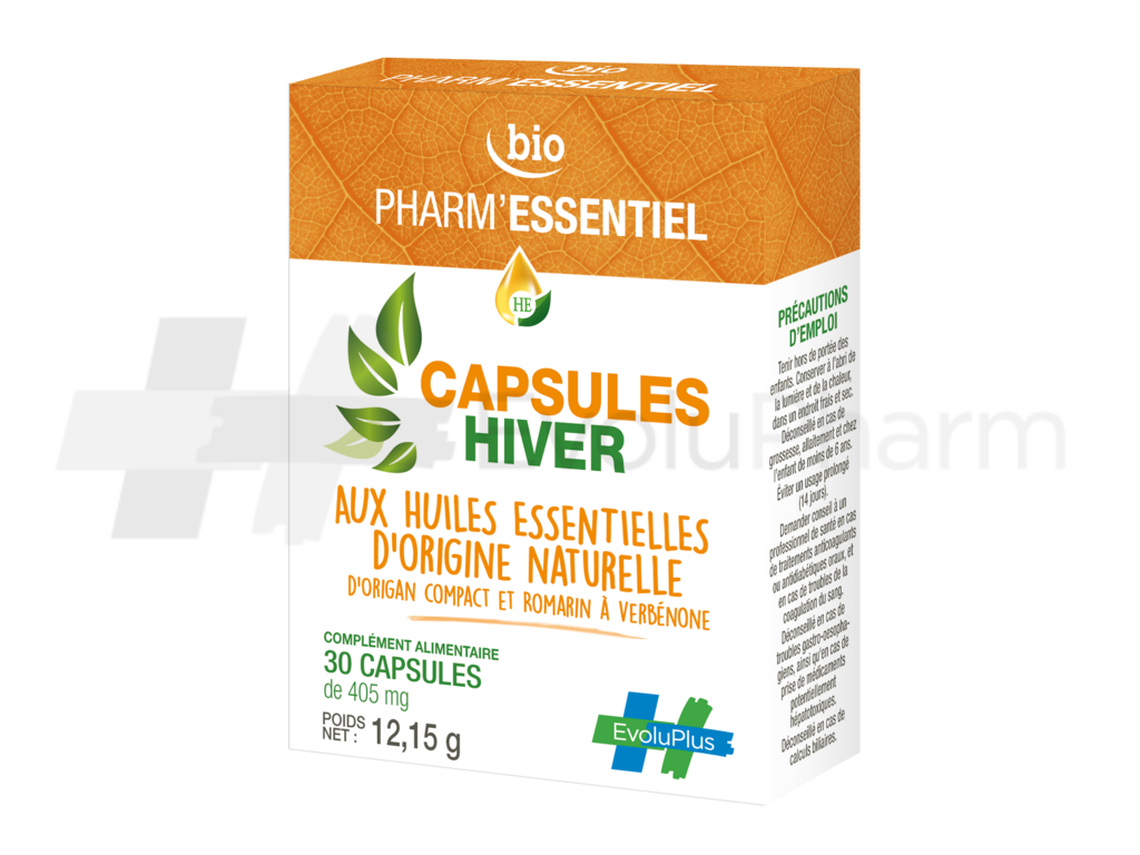 Pharm’Essentiel Bio 30 Capsules hiver est un complément alimentaire. Ne pas dépasser la dose journalière recommandée. Les compléments alimentaires ne peuvent être utilisés comme substituts d’un régime alimentaire varié et équilibré et d’un mode de vie sain. Pour votre santé, mangez 5 fruits ou légumes par jour. www.mangerbouger.fr