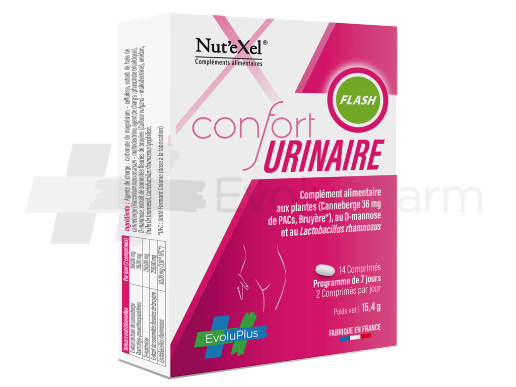 Nut'Exel® Confort urinaire Flash est un complément alimentaire. Ne pas dépasser la dose journalière recommandée. Les compléments alimentaires ne peuvent être utilisés comme substituts d’un régime alimentaire varié et équilibré et d’un mode de vie sain. Pour votre santé, mangez 5 fruits ou légumes par jour. www.mangerbouger.fr