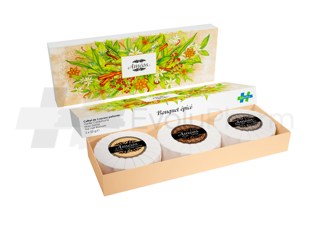 Améos coffret épicé 3 savons de 50g est un produit cosmétique à usage externe. Lire les informations figurant sur les produits avant utilisation.
