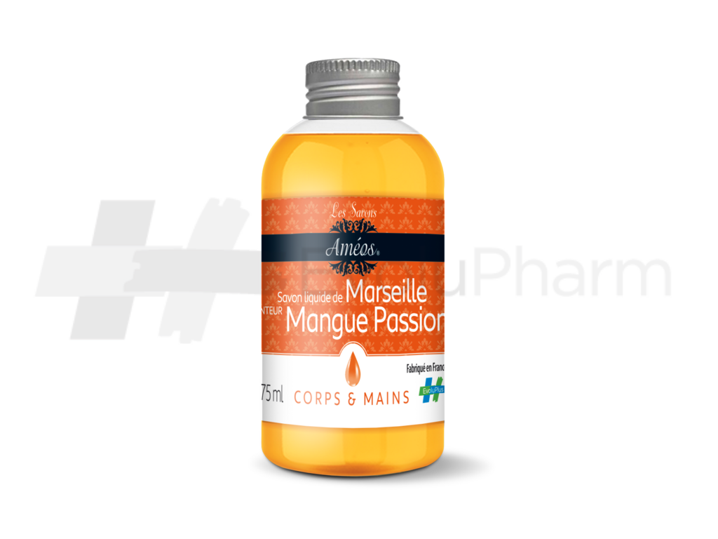 Améos® Savon liquide de Marseille Mangue Passion 75 ml est un produit cosmétique à usage externe. Lire les informations figurant sur les produits avant utilisation.