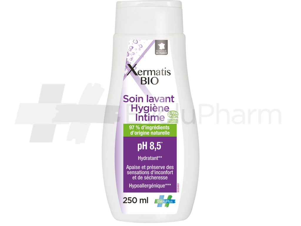 Xermatis BIO Soin lavant hygiène intime pH8.5 250 ml est un produit cosmétique à usage externe. Lire les informations figurant sur les produits avant utilisation.